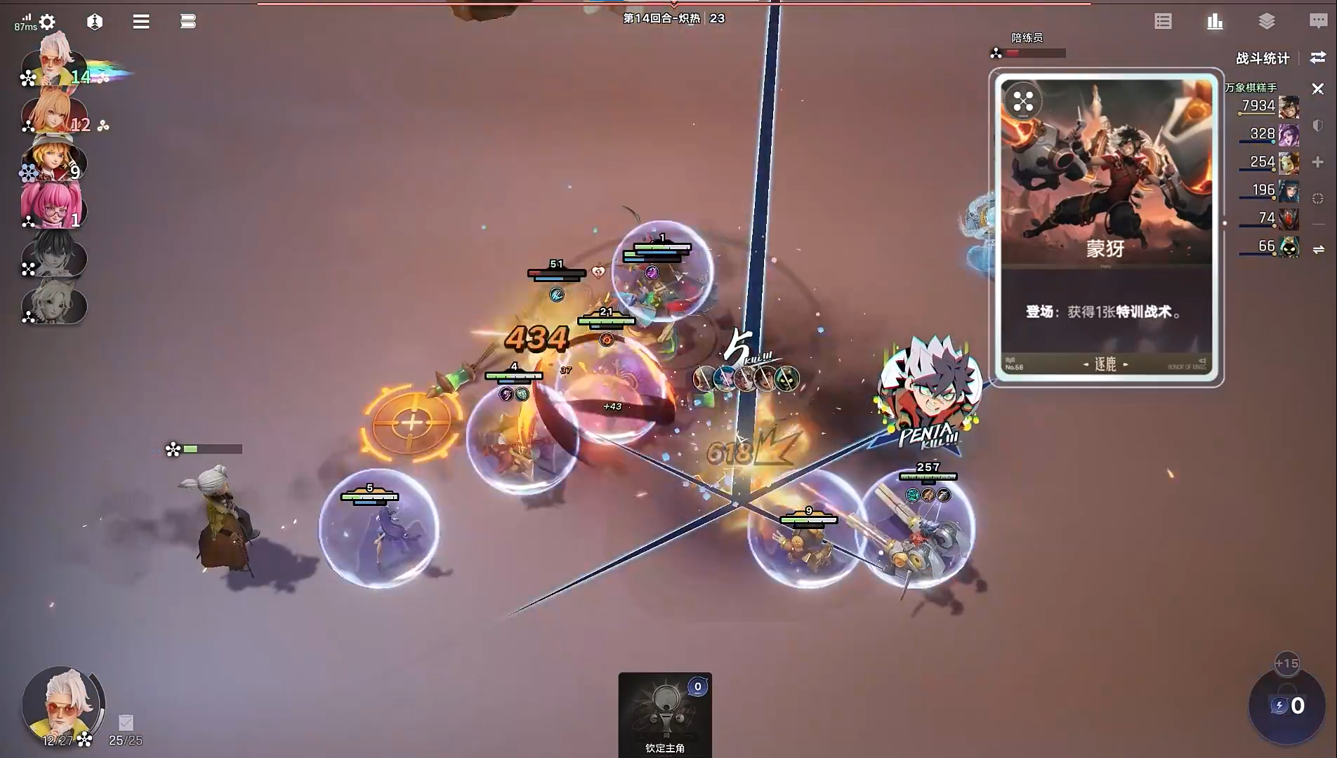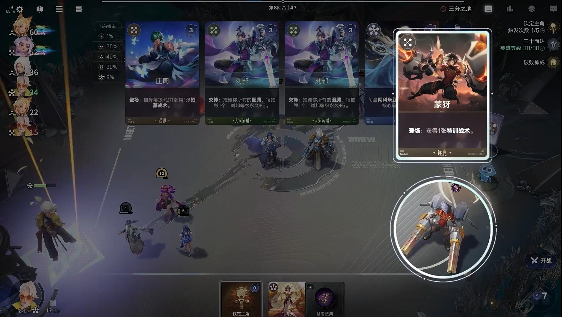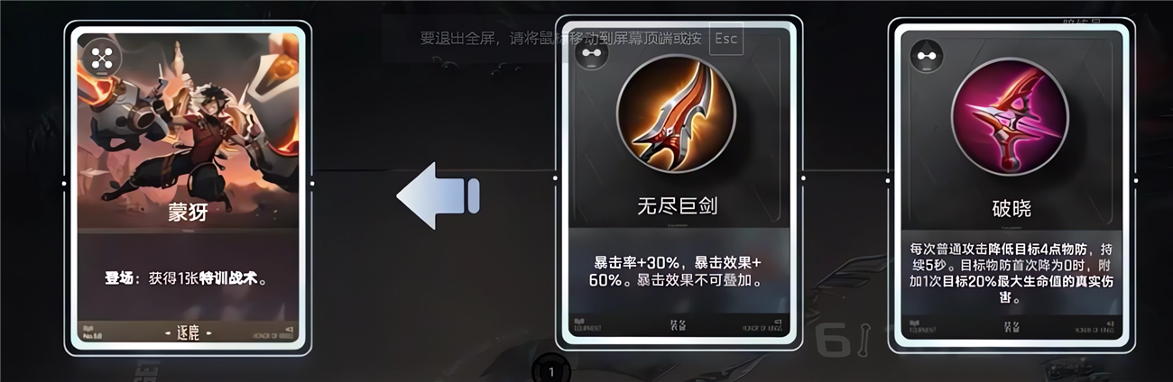 7、开始寻找阵容主力输出蒙犽,并将主力输出装备给予蒙犽。通过不断使用战术牌和其他效果牌,让蒙犽的等级迅速提升。